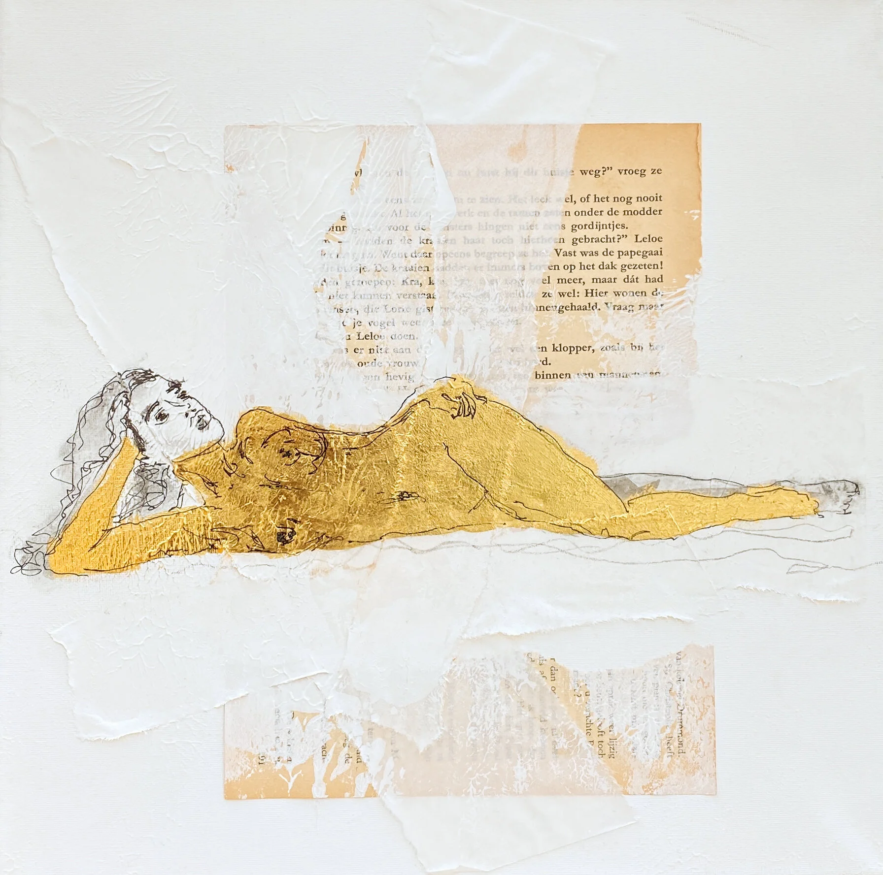 Mix media, old book pages, rice paper, white acryl, Indian ink, charcoal.